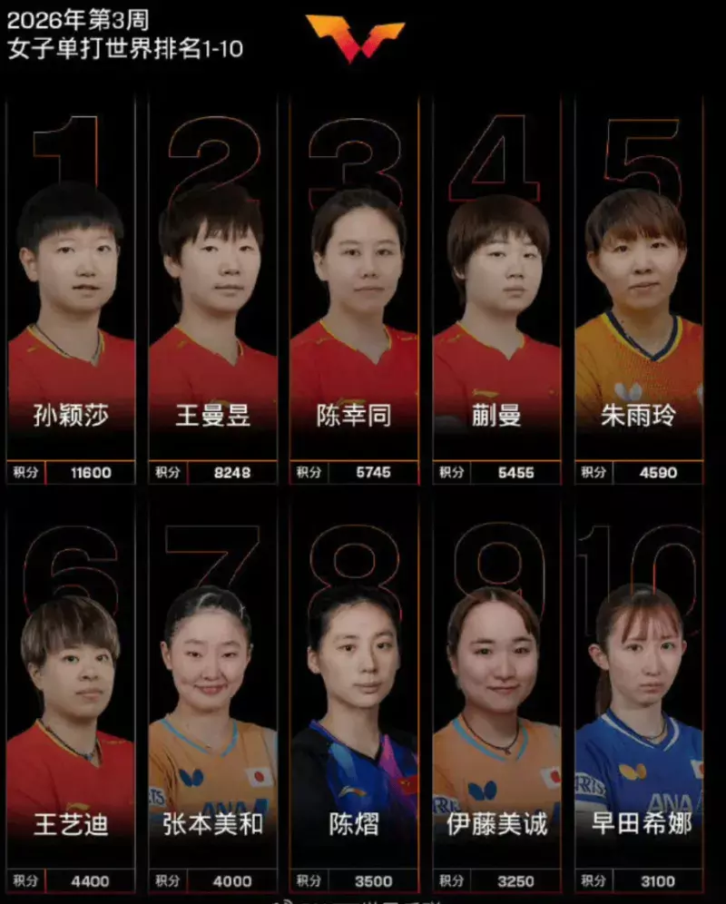 WTT女单最新天下排行:孙颖莎、王曼昱、陈幸同前3